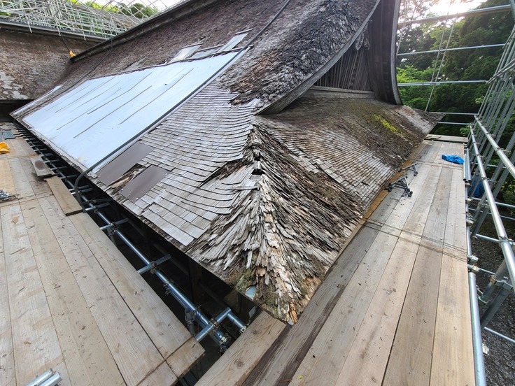 大神山神社奥宮では、前回の屋根葺替えから20年以上が経ち、屋根杮葺きの経年による破損が進んでいます。
