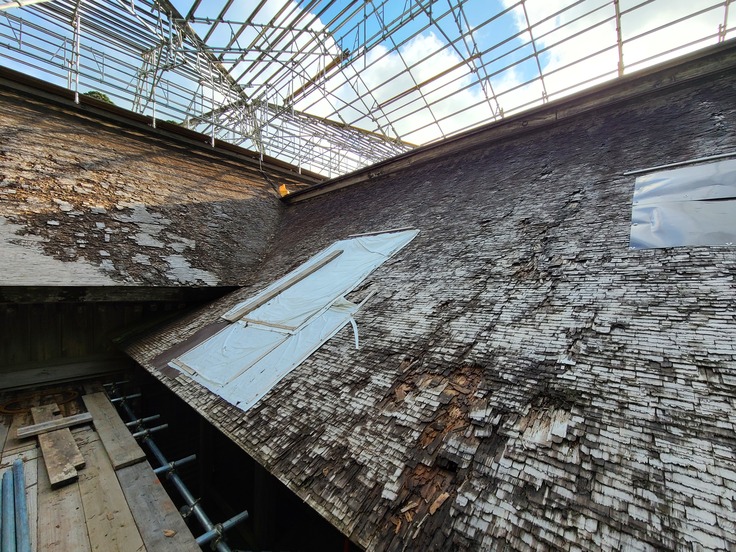 部分的に雨漏りが生じ、屋根周りの部材が腐朽しており、また毎年の積雪により、屋根の変形、部材の緩み、仕口の外れなどが生じています。