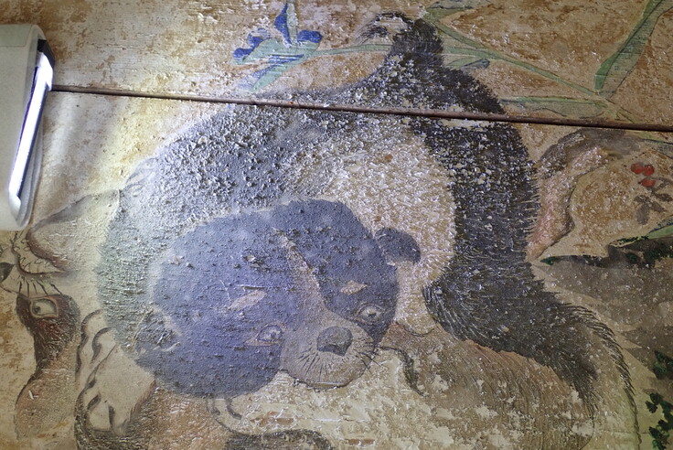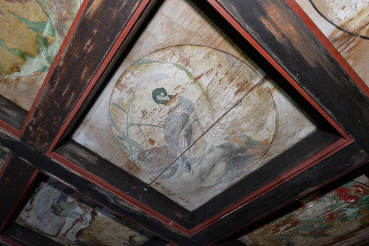 屋根の他にも、内部の天井絵や壁画・彩色は、絵の具が木地から浮いたり剥落していました。