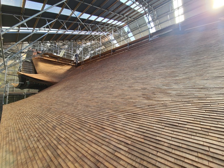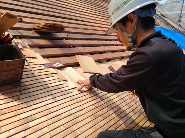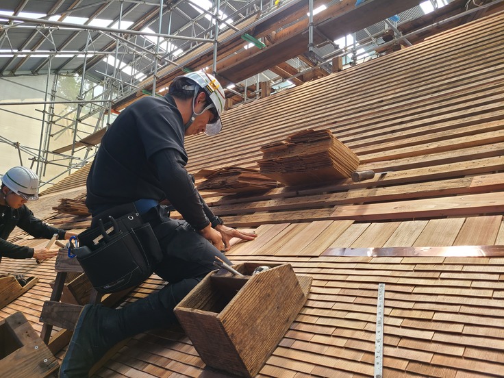 大神山神社奥宮は屋根の面積が非常に広く(およそ1400平方メートル、テニスコート7面分)、修理や杮葺きの作業が間に合わないため、3年に分けて工事を行います。