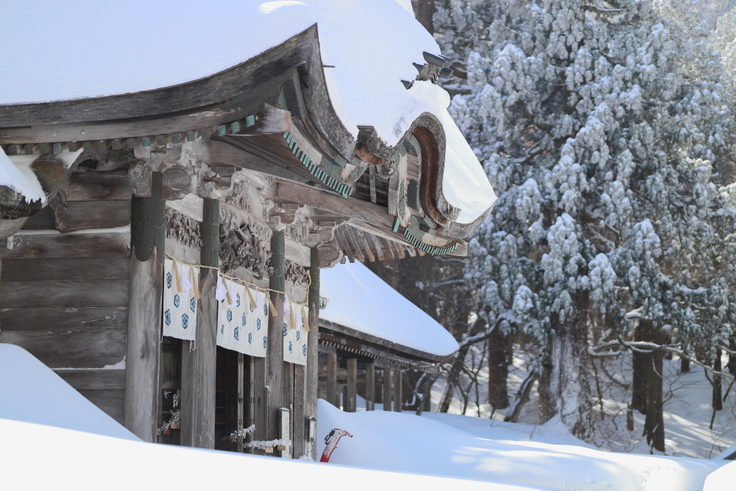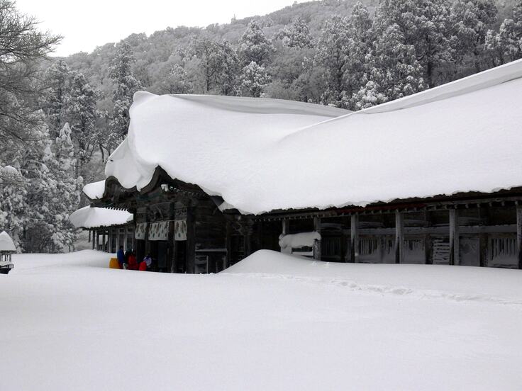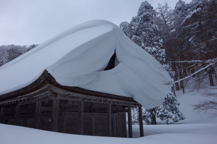 社殿が損傷する最大の原因は、大山の厳しい気候、中でも冬季の積雪です。観測をみると、西日本では圧倒的な雪の量となっており、毎年平均1か月半程度は1m以上の積雪となり、1年の3分の1近くで積雪が見られるなど、積雪が非常に多い上に雪に覆われている期間がかなり長い(東北などの豪雪地に匹敵)ことが特徴となっています。