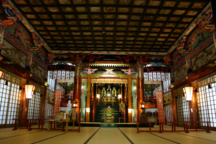 屋根は、総杮葺(そうこけらぶき)、入母屋造。また、拝殿は壮大な唐破風をつけ、柱間は3つあり、中央入口の柱間は内側より広く、柱は円柱で50cm近くあります。幣殿内の格天井には美しく彩色された234枚もの花鳥人物が描かれており、豪華を極めております。