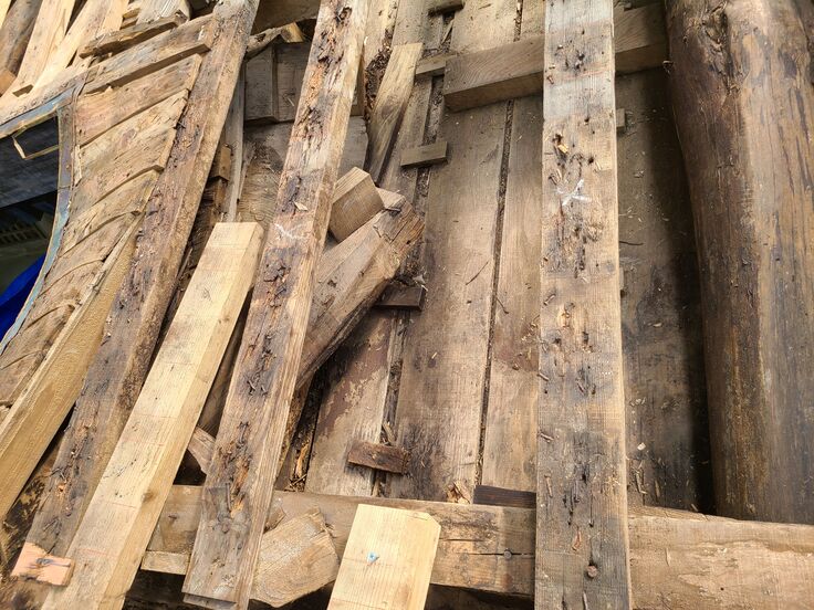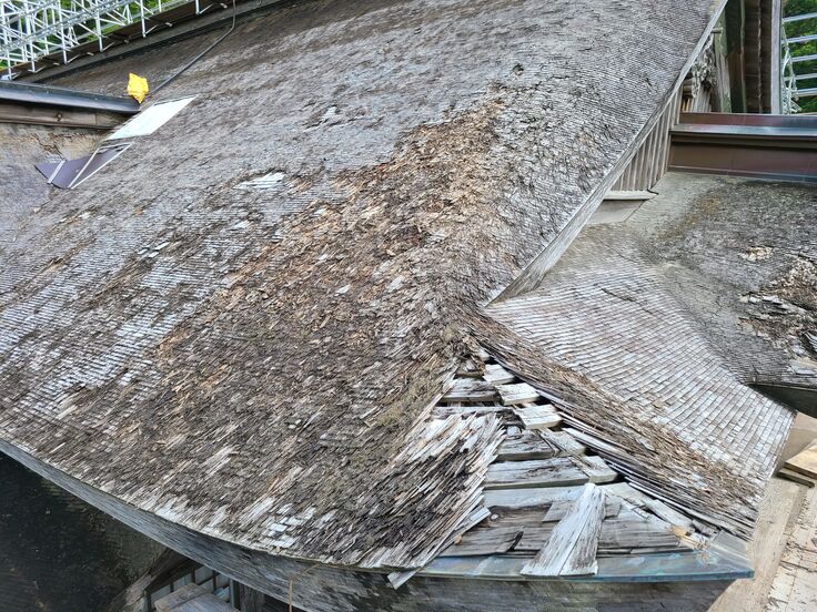 大神山神社奥宮では今回「維持修理」にあたる、屋根替え部分修理を行います。傷んだ屋根の杮板を一旦すべて取外し、野地(のじ:屋根の下地)や小屋組(こやぐみ:屋根内部の骨組)の傷んだところを補修して、屋根を葺き直します。