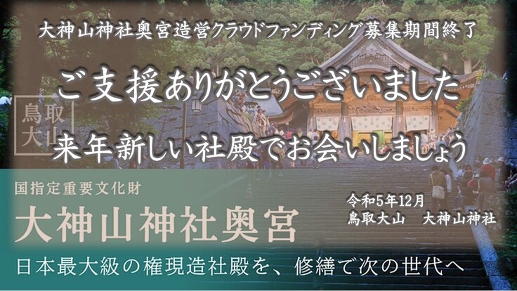 大神山神社奥宮造営クラウドファンディング最終結果(12月16日朝)