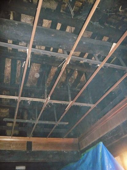 ただしこれがダイレクトに屋根の裏側でなく、屋根裏にしまってある、予備の茅なのです。屋根がトタンで覆われてしまった今や、二度と出番の回ってこない茅。多少の断熱効果はありそうですが、家に対して荷重にもなっています。