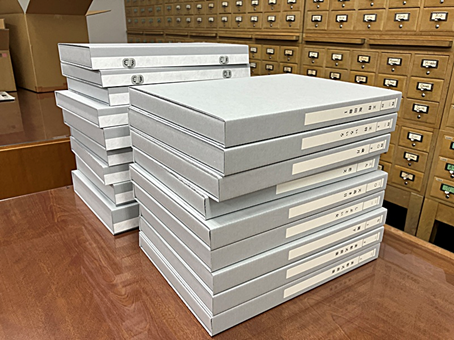 皆様のご支援のおかげで、【北條秀司スクラップブック】約550冊については保存箱への収納作業が完了しております。長年段ボール箱や封筒に収納されていた原稿なども、中性紙の封筒に入れ替えて、保存箱に収納しました。