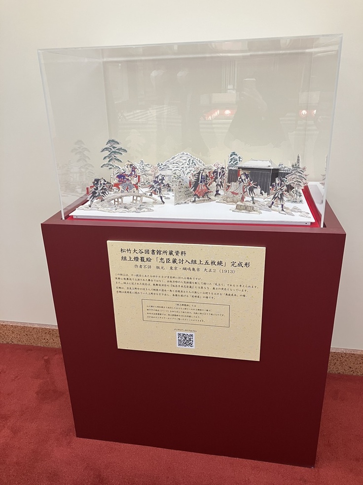 『仮名手本忠臣蔵』の上演にちなんで、歌舞伎座二階ロビーにて、当館所蔵資料の組上燈籠絵 「忠臣蔵討入組上五枚続」(大正2(1913)年発行)の完成形が展示されています。