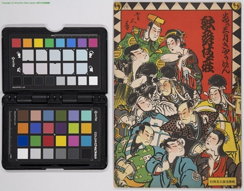 1月より、松竹創業百三十周年を記念した歌舞伎座チラシデザインに、当館デジタルアーカイブより戦前の歌舞伎座筋書の表紙画像が使用されています。3月は、昭和11(1936)年3月に、歌舞伎座で『仮名手本忠臣蔵』を上演した際の筋書の表紙を活用したオマージュデザインとなっております。歌舞伎座などでお見かけの際は是非お手に取りくださいませ。