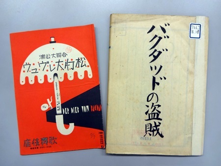 右:『バグダッドの盗賊』[「松竹大レヴュウ」で上演]台本(フライングカーペットその他の夢幻的な舞台装置が評判になった、東京松竹楽劇部によるレビューです)
