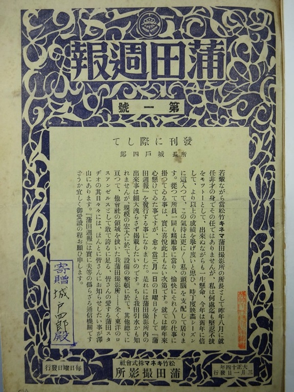 『蒲田週報』は城戸所長の発案で大正14年に創刊された機関誌で、その創刊号の表紙には「蒲田撮影所内の出来事は細大漏らさず掲載したい」「皆さんの愛する蒲田スタヂオの其日々々には、ほんとにみなさんにお知らせしたいことが澤山にあります。」という城戸四郎の言葉が掲載されています。