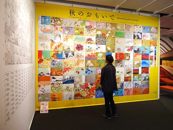 歌舞伎座ギャラリーの入口を入ると、まず正面の色鮮やかな展示が来場者を迎えてくれます。これは、第四期歌舞伎座(昭和26年[1951]~平成22年[2010])の歌舞伎興行の筋書(プログラム)の表紙をコラージュした展示で、現在開催中の【歌舞伎 秋の彩り】展の筋書コラージュ「秋のおもいで」では、9~11月の秋の興行より厳選した116点の筋書が美しく配置されています。