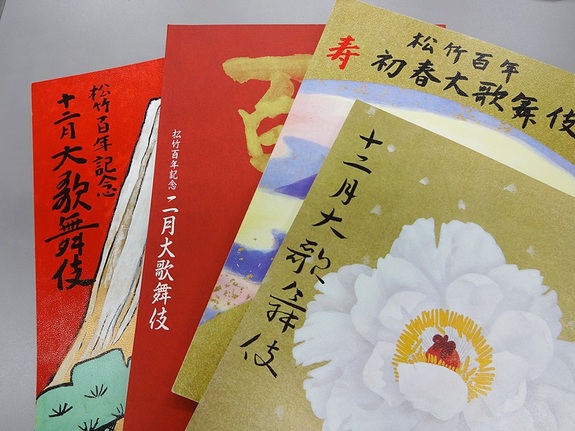 歌舞伎座の筋書の表紙のデザインは、「画家がオリジナルで描いたもの」「歌舞伎座が所蔵する絵画を使用したもの」「季節や興行に合った主題の浮世絵を使用したもの」などがあり、それぞれ筋書の表と裏を美しく彩っています。画家のオリジナルでは、季節を象徴するような花や鳥、果物、また正月興行はおめでたく富士山が描かれることが多く見られます。この筋書コラージュの展示は、日本独自の季節感が美しく表現されているという事で、特に外国のお客様に人気が高いそうです。