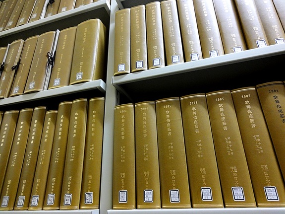 松竹大谷図書館の書架に並ぶ合本製本された第四期歌舞伎座の筋書