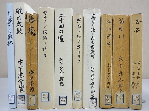 次に木下惠介監督作品です。こちらも戦後の作品から10本をリストに選んでみました。昨年2012年12月は木下惠介生誕100年にあたり、今年の年末にかけて関連行事が行われています。『お嬢さん乾杯』は没落貴族のお嬢様と戦後成金の男の恋を描く作品で、本年1月、生誕100年記念として新派公演で舞台化もされました。『破れ太鼓』は時代劇の大スターである阪東妻三郎さんを現代コメディに起用し話題を呼んだ作品です。『善魔』はこの映画の役名「三國連太郎」をそのまま芸名にし、本年4月に90歳で亡くなるまで、この芸名を愛し名乗り続けた三國連太郎さんのデビュー作です。『カルメン故郷に帰る』は日本初の総天然色(カラー)映画で、白黒版も同時に撮影されました。当館にはタイトル部分にそれぞれ「総天然色」「白黒版」と入った二種類の完成台本が保存されています。『楢山節考』は姥捨山伝説をモチーフとした作品で、老婆を演じるために歯を抜いた田中絹代さんの熱演が話題になりました。またその孫役として二代目市川猿翁さん(当時:市川團子)も出演しています。『笛吹川』は戦国時代の貧しい農民一族の年代記を描いた作品ですが、九代目松本幸四郎さん(当時:六代目市川染五郎)、二代目中村吉右衛門さん(当時:中村萬之助)の兄弟が出演しています。『二十四の瞳』『喜びも悲しみも幾歳月』は、当時映画館でご覧になった、という利用者の方が、スチール写真を見ながら台本を嬉しそうに読んでおられる姿をよく拝見します。映画館でのいい思い出は、何年たっても色あせないものなのですね。