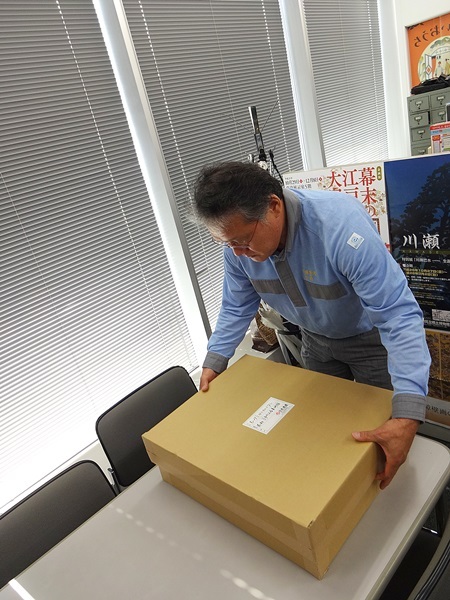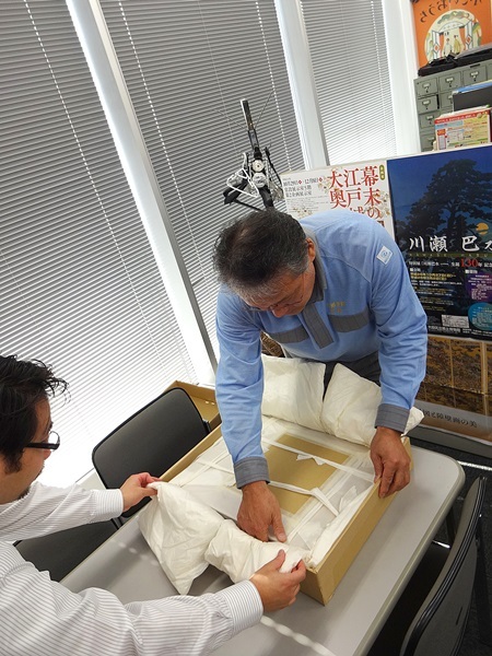 丁寧に梱包がとかれていきます。(左は島根県立美術館の学芸員さんです)