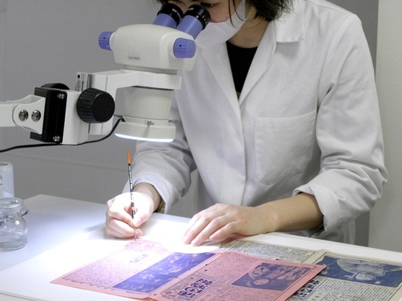 スポットテストは、ドライクリーニングの後に行う水性脱酸性化処置や、セロテープ除去に備え、インクの耐水性、耐溶剤性を確認する作業です。 脱酸性化処置に使われる水溶液やセロテープ除去に使われる溶剤を、細い筆先で印刷の端につけて、資料をそのままの状態で観察する事ができる【実体顕微鏡】で、印刷インクの反応を観察します。そして、 処置により印刷が剥離したり、溶けたりしないよう入念に計画が立てられます。