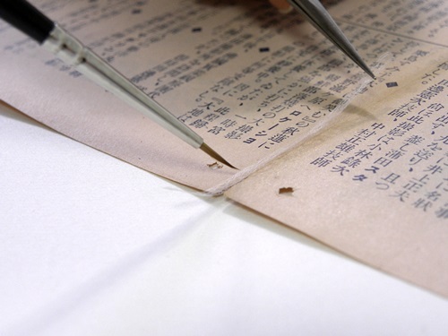 裂け目の部分に補修用紙を生麩糊で貼り合わせます。