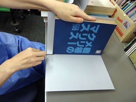 紐をつけ、表紙と背表紙に映画のタイトルを書いて完成です。新しい板目紙がつやつやと輝いています。書架に並んだときに見やすいよう、大きさや位置などに注意しつつ、タイトルを筆で書きます。