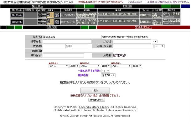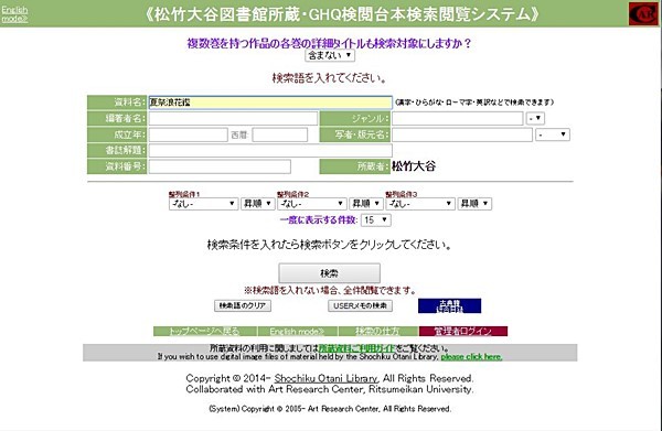 システムの開発及び公開は、松竹大谷図書館と立命館大学アート・リサーチセンターとの間で結ばれた協定に基づき、アート・リサーチセンターが行っています。当館HPトップページの【利用案内】「「貴重書」検索・閲覧サービス」にもリンクが貼られております。詳しい利用法についてはご利用ガイドをご覧ください。