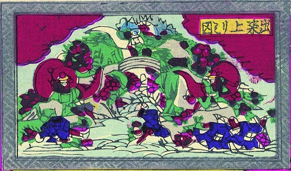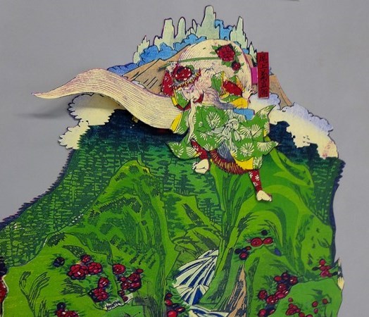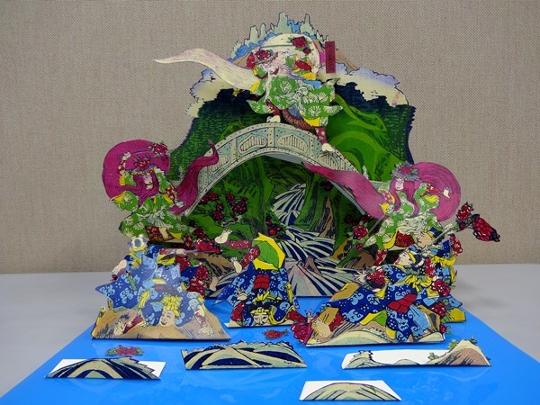背景の山の中央に橋があり、その欄干に白い毛の親獅子がのっている様子が(何となく)分かります。橋の奥からは手前に向かって清流が流れてきています。この風景をイメージして、背景に橋を貼り付けていきます。