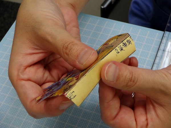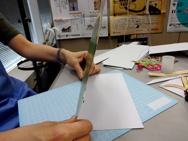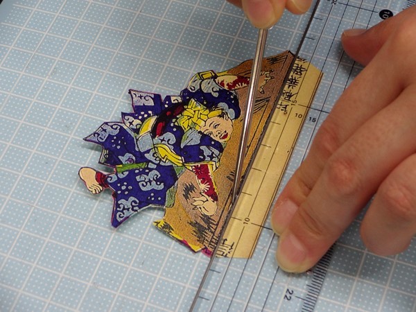 きれいに折れ目が付くように定規を当て、先の丸い目打ちを使って折れ線をなぞります。この四天(捕り手)は下部に欄外の紙を付けたまま切ったので、折る部分を大きくとることが出来ました。