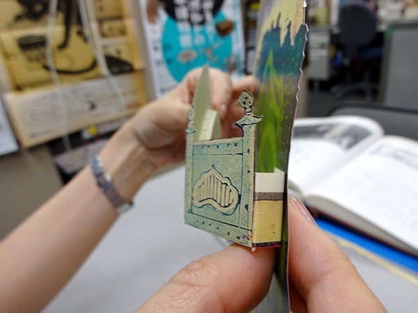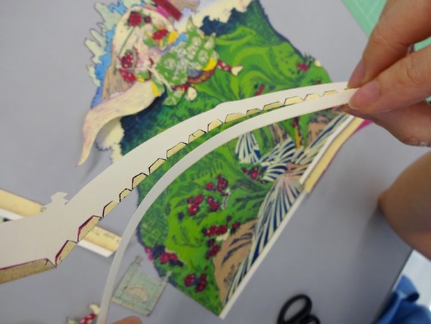 橋のパーツの下部はギザギザの「のりしろ」になっています。この「のりしろ」で背景に橋を直接貼り付けてもいいのでしょうが、私たちは舞台の大道具をイメージして少し立体感を出すことにしました。組上燈籠絵を切り抜いたあとに残った端の細長い部分を利用し、床板として「のりしろ」に貼ります。