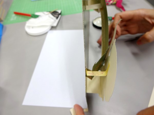 橋や獅子を背景に取り付けるには、ある程度強度が必要なので、裏側ほぼ全面に台本カバーの材料として使っている板目紙をL字に貼り付けます。L字にすることで背景が自立します。
