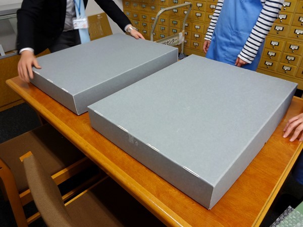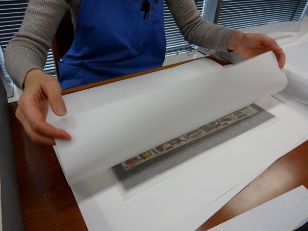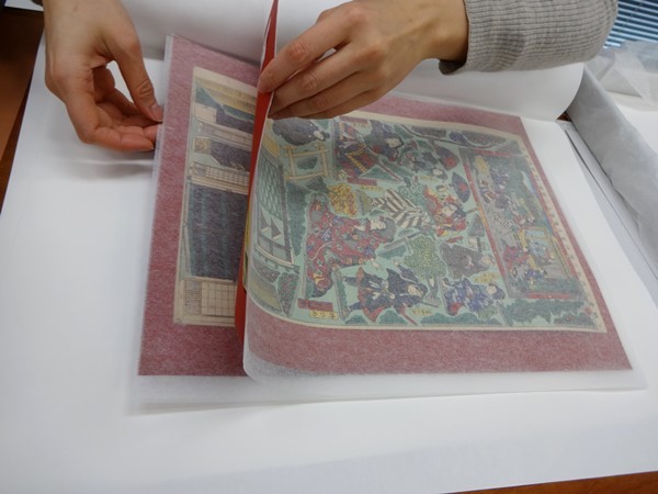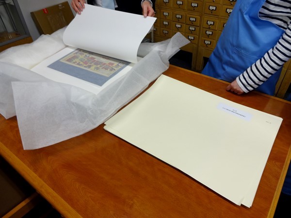 今回、このプロジェクトで目標額を超えるご支援を頂いた結果、資料保護用の中性紙を購入し、撮影作業終了後の組上燈籠絵を中性紙で挟んで頂くよう、インフォマージュのスタッフの方にお願いする事が出来ました。また、表面の保護のため薄紙を入れて、複数枚組のものは「組上燈籠絵」同士が擦れることを防ぐため、間紙も入れて頂くようにしました。今後は当館書庫において、より保存に適した環境で保管する予定です。