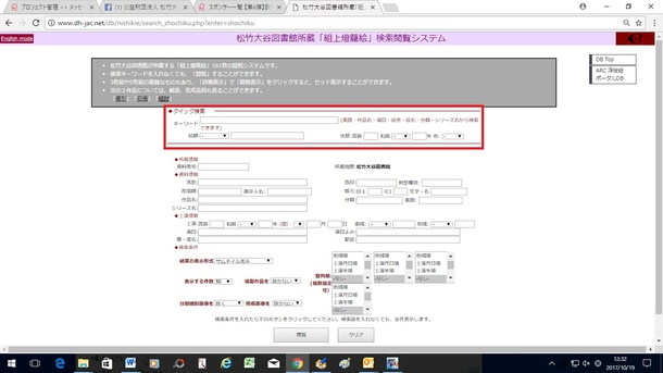 こちらが、 《松竹大谷図書館所蔵「組上燈籠絵」検索閲覧システム》のトップ画面です。上部の赤枠で囲った「●クイック検索」での検索が分かりやすくおすすめです。作品名などの検索語を[キーワード]の項目に入力して、一番下の「閲覧」というボタンをクリックすると、検索ができます。ここで検索語を入力しないで「閲覧」ボタンをクリックした場合は、下の画像のように全件表示されます。
