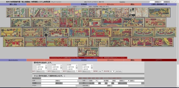 この検索・閲覧システムは【第5弾】プロジェクトのご支援で、「組上燈籠絵」のデジタル撮影及びデータベース化を行ったもので、松竹大谷図書館が所蔵する161点の「組上燈籠絵」を検索し、全点閲覧できるようにしたものです。