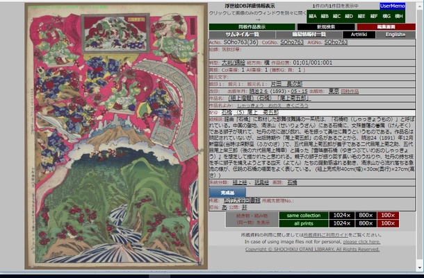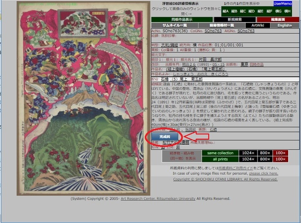 1件だけヒットしました。表示されたサムネイル画像(赤枠部分)をクリックすると、画像と詳細情報が表示され、組上燈籠絵に関する詳しい内容を見る事ができます。