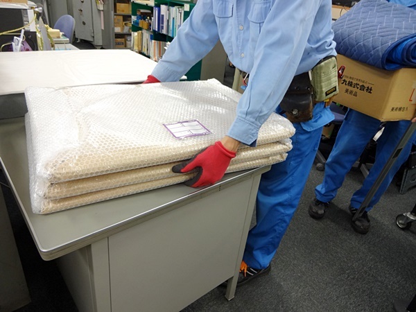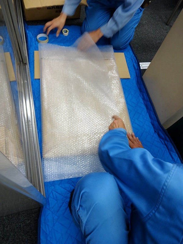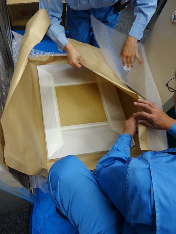 その作業が終わったものから順次、美術品専門の輸送業者さんが丁寧に梱包し、約2時間の作業の後に藤澤浮世絵館に向けて出発して行きました。会期中、なるべく多くの皆様にご覧いただけるよう祈っています。