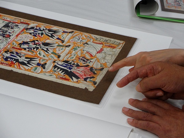 藤澤浮世絵館からは2名の学芸員さんが見え、当館スタッフの立会いの下、まずは一枚一枚、丁寧に目視で組上燈籠絵の状態をチェックします。非常に大事に扱われてきており状態も良いとはいえ、作品によってはすでに130年ちかく経っている錦絵ですから、経年による紙の汚れやスレ、色移りがあるのは否めません。