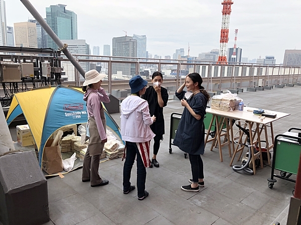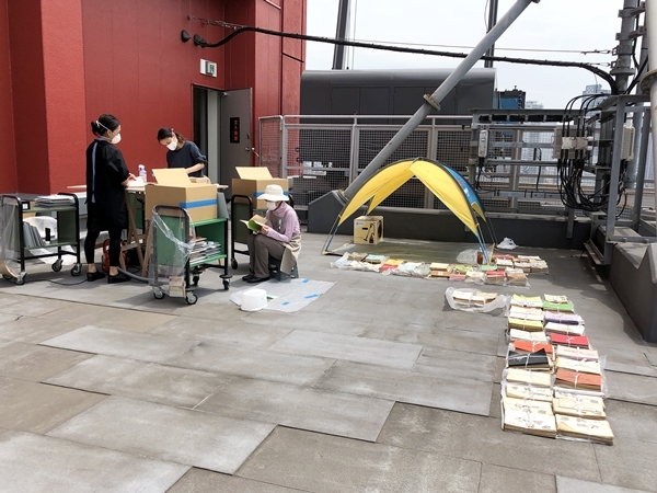 さて、最近ご寄贈頂いた資料にカビが付着してしかも湿気を含んでいたため、先日向いの東劇ビルの屋上をお借りして資料のクリーニングと天日干しを行いました。