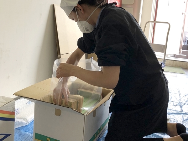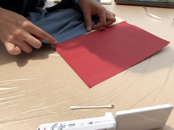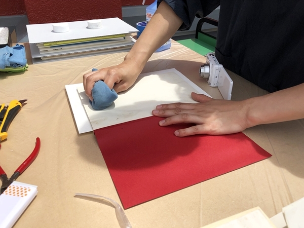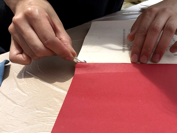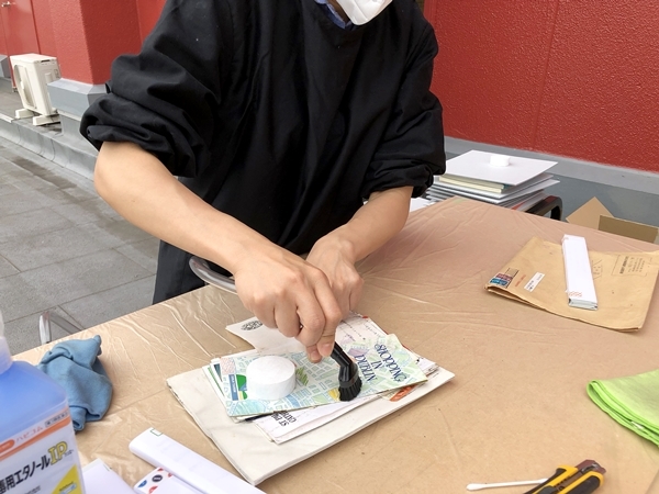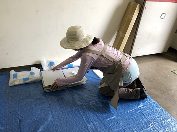株式会社資料保存器材は、この【第6弾】プロジェクトで、映画スクラップブック保護のためのアーカイバル容器の制作をお願いした資料保存のプロフェッショナルですが、修理部門では、虫やカビの被害を受けた紙資料のクリーニングや修理も行っています。今回は、その修理部門のお力を借り、スタッフ2名の方に資料のクリーニングを行っていただき、当館スタッフが資料の乾燥作業をお手伝いしました。