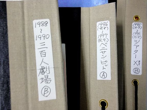 また、紀伊國屋ホール、PARCO劇場、シアターコクーン、本多劇場など公演数が多い劇場は綴込み表紙と綴りひもを使って仮綴じにしておき、後日プログラムが入手できた時に挿入・追加できるようにしています。