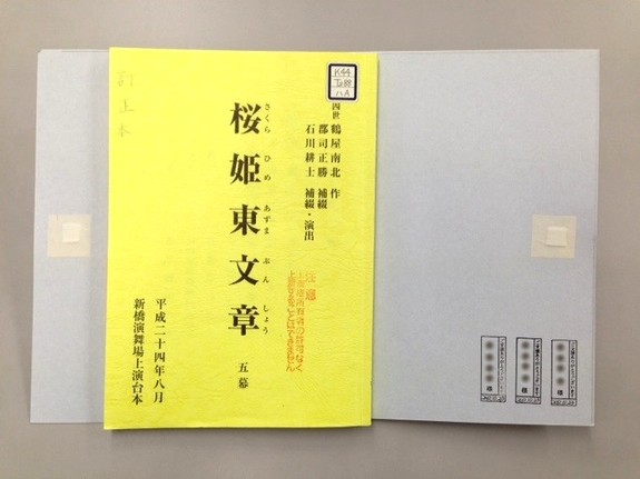 通常、台本閲覧のご請求があった場合、台本カバーは書架に残したままで、閲覧にはお出ししておりませんので、台本カバーをご覧になりたい支援者の方は、カウンター係にお申し出下さい。