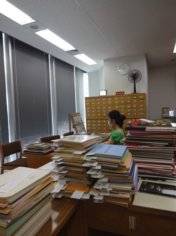 8月3日より18日までの2週間、特別資料整理期間のため休館し、人手の必要な棚移動や、データの読み合わせなど、開館時には出来ない作業を行っています。また定期的に寄贈される資料の他に、個人の方からの大量寄贈資料を一挙に整理するため、閲覧室で資料を広げて効率よく仕事を進めております。