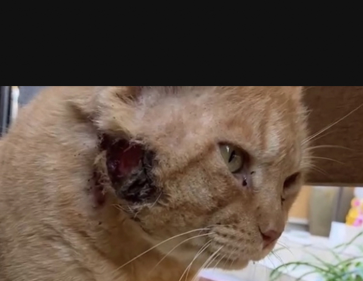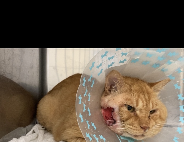 今回ベンケイくんのお顔 猫同士の喧嘩でできた傷でした。古傷もふくめ長期にわたり治療ができずにいたことから化膿が進み傷も深くそして広がっていました。