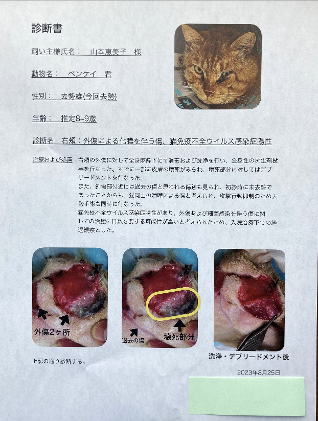 診断名「右頬 外傷による化膿を伴う、猫免疫不全ウイルス感染症陽性」