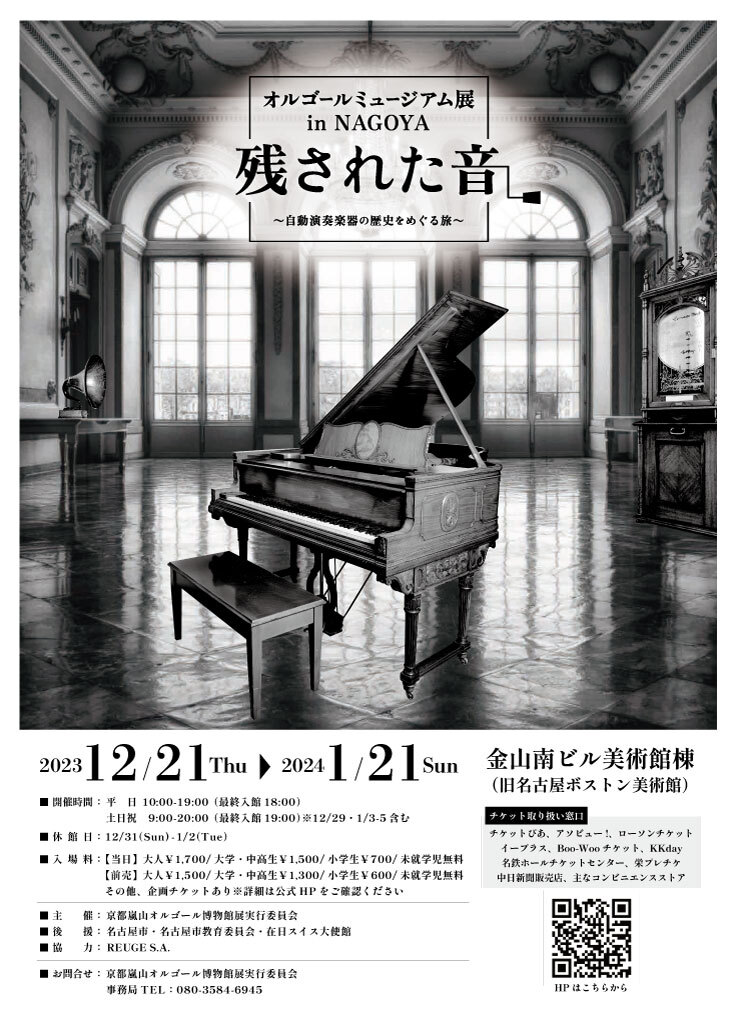 株式会社翔屋を主体とする"京都嵐山オルゴール博物館展実行委員会"が名古屋市の旧名古屋ボストン美術館で「オルゴールミュージアム展 in NAGOYA」を開催します。集まった資金は、本企画展のメイン作品となるスタインウェイ自動演奏ピアノの修復費用に使用します。
