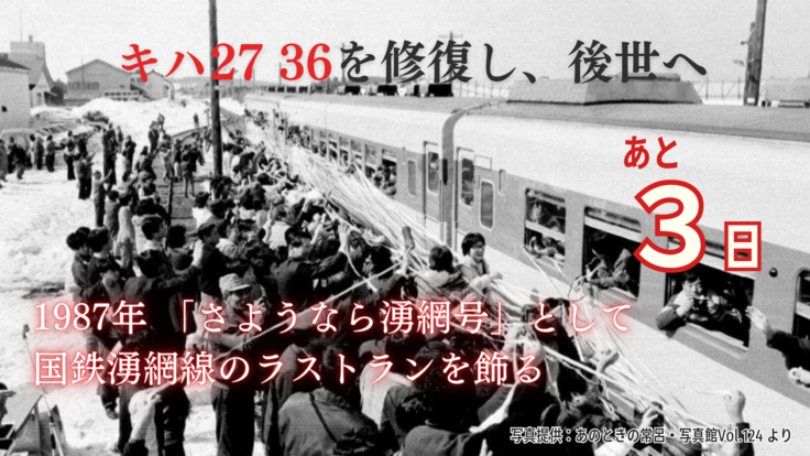 現在、キハ27 36の塗装と、劣化が進んでいるDD14の塗装/修復をするため、第二目標である【900万円】に向けてラストスパートをかけております。