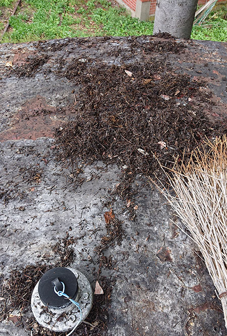 最も心配だった屋根の状況ですが、屋根部の腐食による穴あきはありませんでした!ホッとしております。もしも穴あきがあればボディ外装と内装の間に雨が侵入し、かなりの腐食が予想されるからです。しかし、雨どいには松の枯葉がかなり堆積しています。