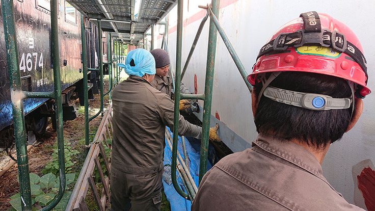 グラインダーを使った錆落とし⇒防錆剤(錆チェンジャー)の吹付⇒錆止め塗装までを私が行い、その後業者さんがリベット打ちをします。私がやる下処理作業とリベット打ちとの競争です。