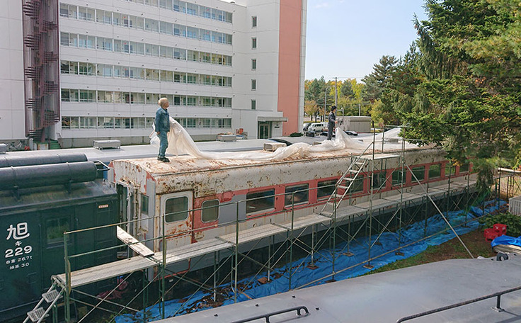 札幌を早朝に出発していただき、8時半から車体の養生作業が開始されました。