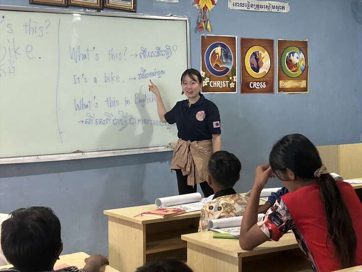 将来、教師をめざっしているだけあって、カンボジアの子どもたちへの指導が直接自分自身の実習になっています。