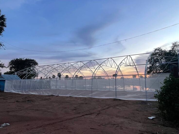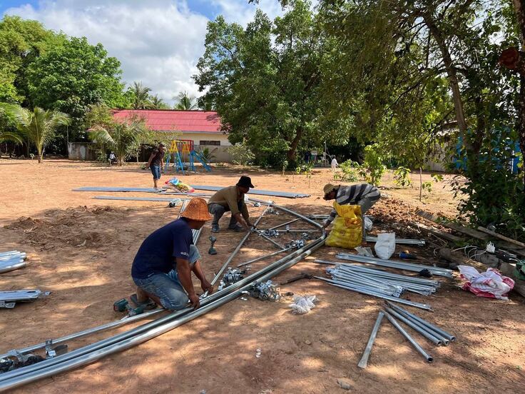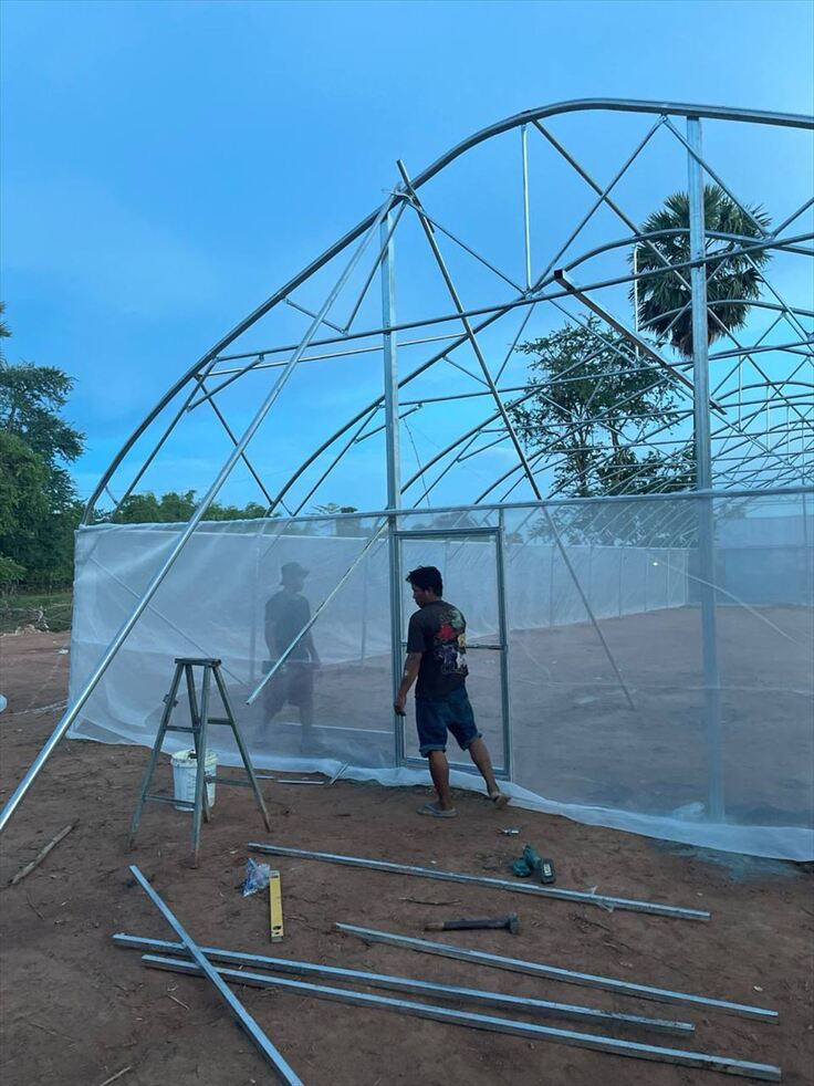 高品質な輸入資材です。作業員さんたち数人が、午後の涼しい時間帯に組み立てをしています。