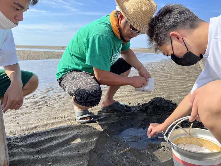 (出てきてもすぐに戻ってしまうマテ貝。気長に待って捕まえます。)