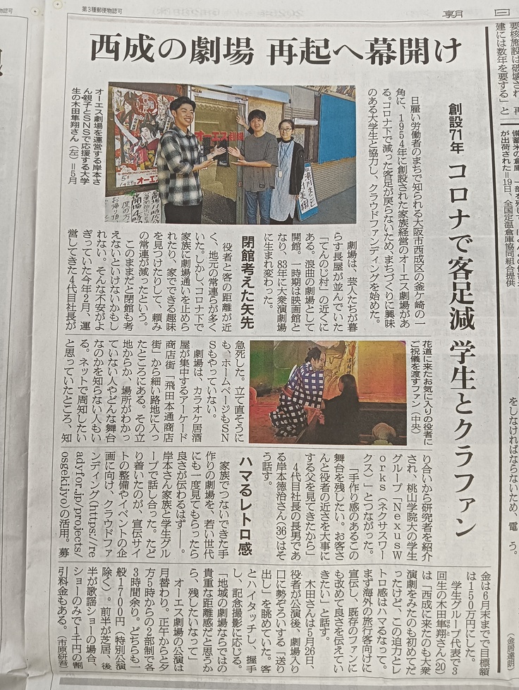 この度は、オーエス劇場の「昭和から続く大阪・西成の大衆演劇場、学生さんの力で未来へ繋げたい!」プロジェクトを応援くださいまして、誠にありがとうございました。皆さまの温かいご支援のお蔭で、目標金額の150万円に到達することができました。
