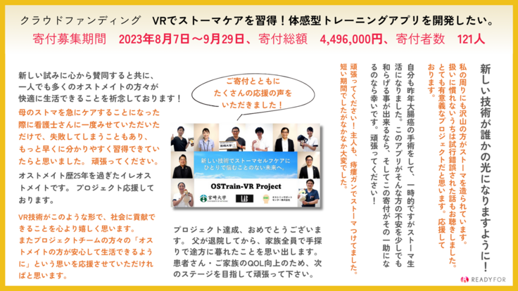 皆さまの温かいご支援により、クラウドファンディング「VRでストーマケアを習得!体感型トレーニングアプリを開発したい!」は、121名の方から総額4,496,000円ものご支援をいただき、無事にその活動を終了いたしました。改めまして、心より御礼申し上げます。今回のクラウドファンディングでは、ご支援をいただいた皆さまをはじめ、オストメイトやその支援者のためにと、コンテンツへのアイデアや活用法について貴重なアドバイスをくださった方々、励ましのお言葉をかけてくださった方々、本当に多くの方々からお力添えをいただきました。皆さまのご厚意とご支援に、心より感謝申し上げます。